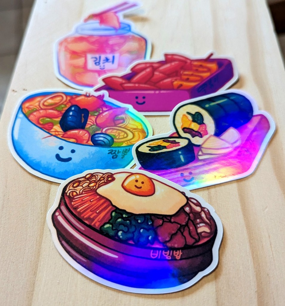 Cute Korean food sticker set! Includes Bibimbap, Kimbap, Ddeokbokki, Kimchi, and Jjampong (technically a Chinese/Korean fusion dish). Laminated and water resistant, dishwasher safe. Comes in holographic laminate or clear gloss laminate.